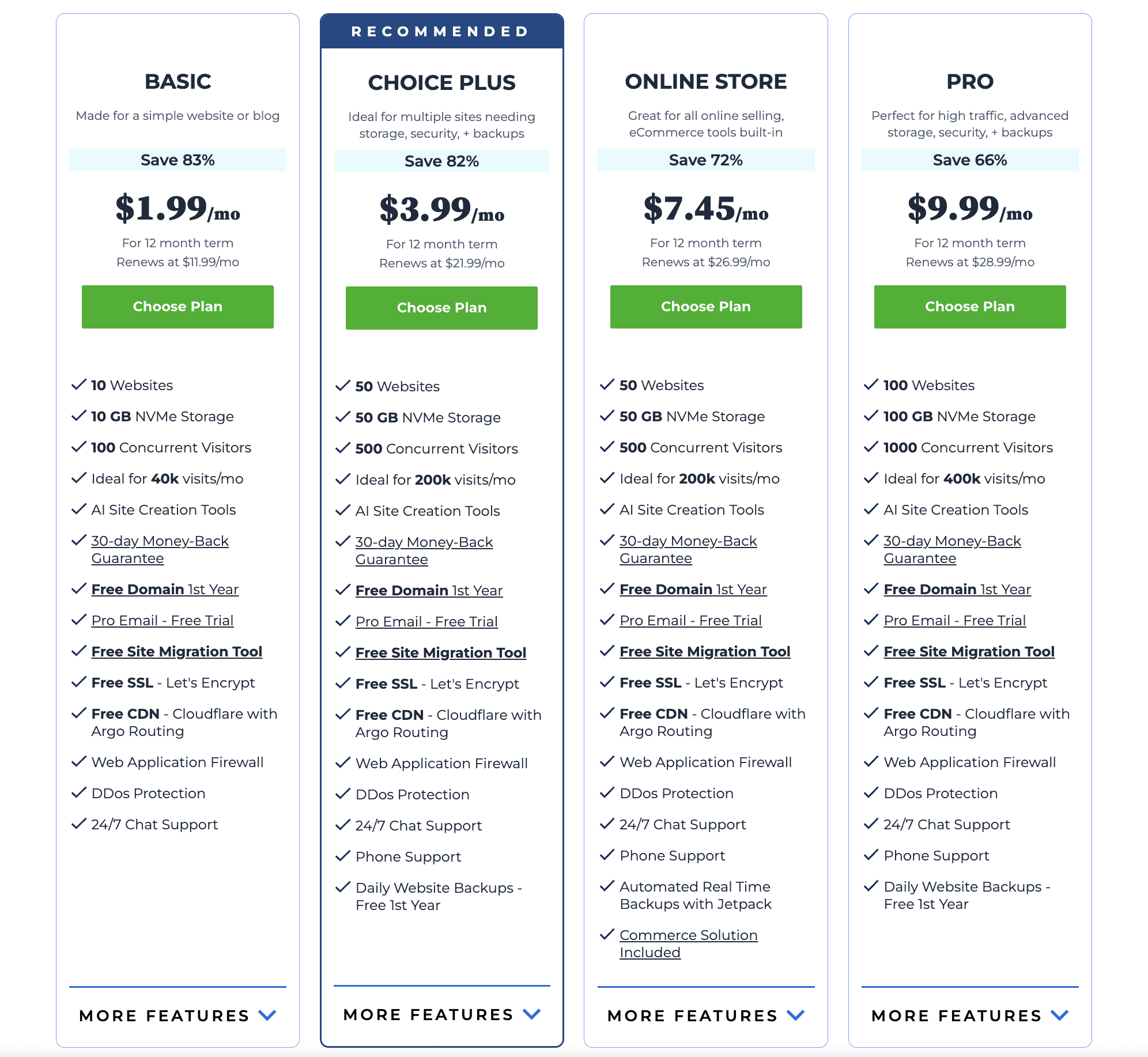 Here’s a quick look at the range of packages Bluehost has to offer, for reference: