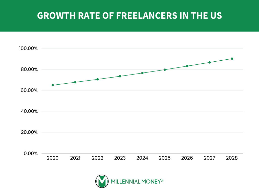 A recent study from Statista estimates that 90.1% of the workforce will be taking on freelancing work by 2028, based on the rise in freelancers over the last several years. Here’s an overview of the data:
